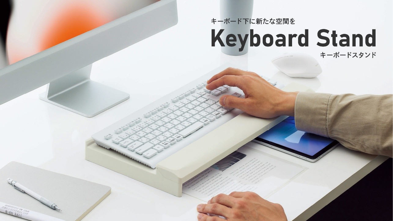 つぎに、キーボードスタンド。その名のとおり、キーボードの“下”を使えるスペースに変えるアイデア製品です。たとえば、タブレットやメモ、封筒、小型のテンキーなど、机の上を散らかしがちな小物がすべて避難できます。
