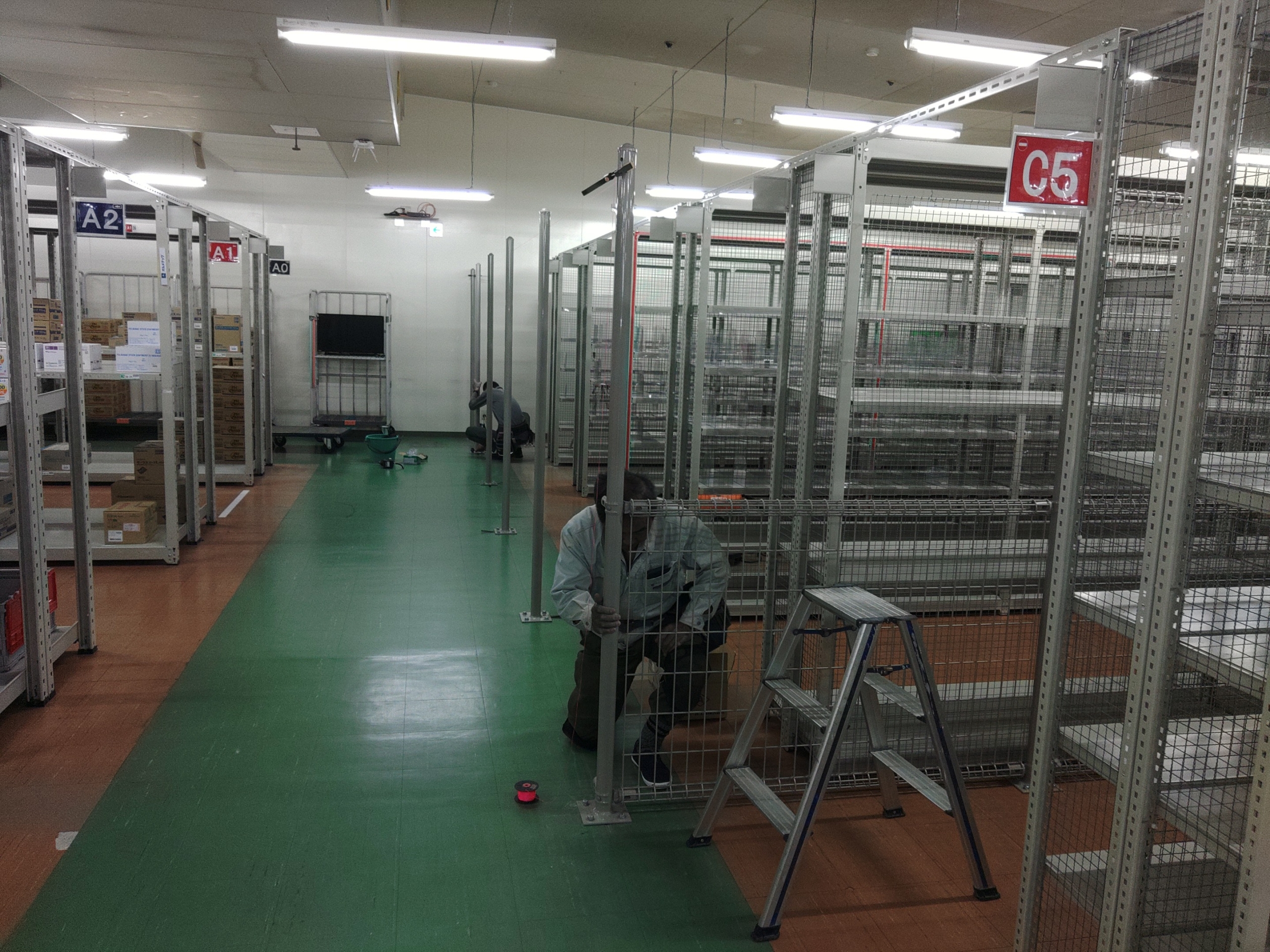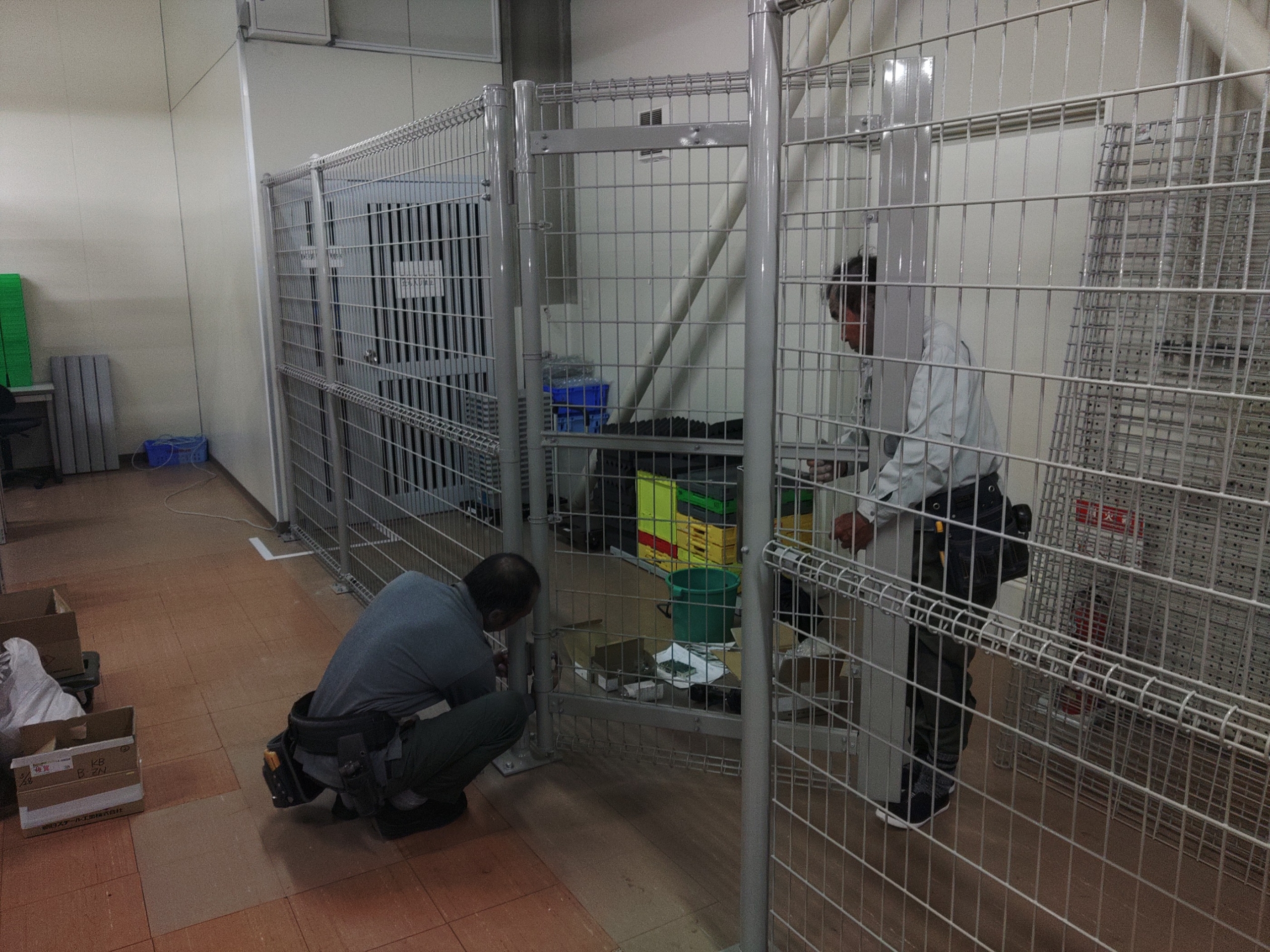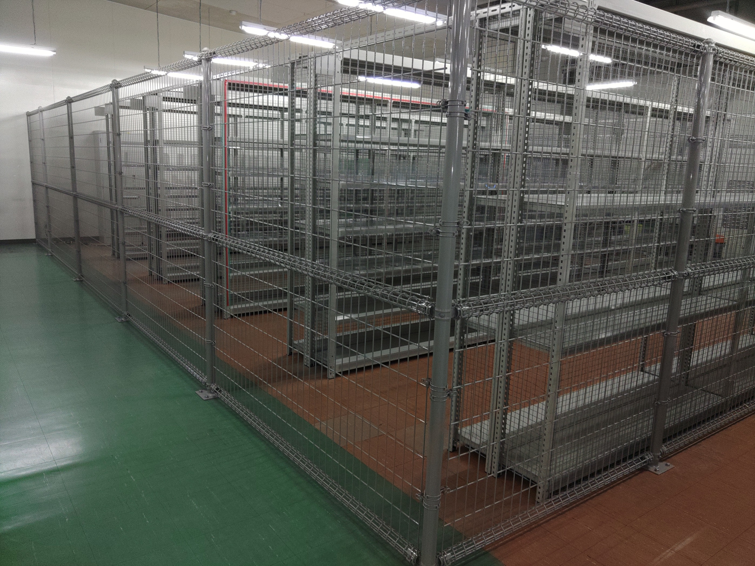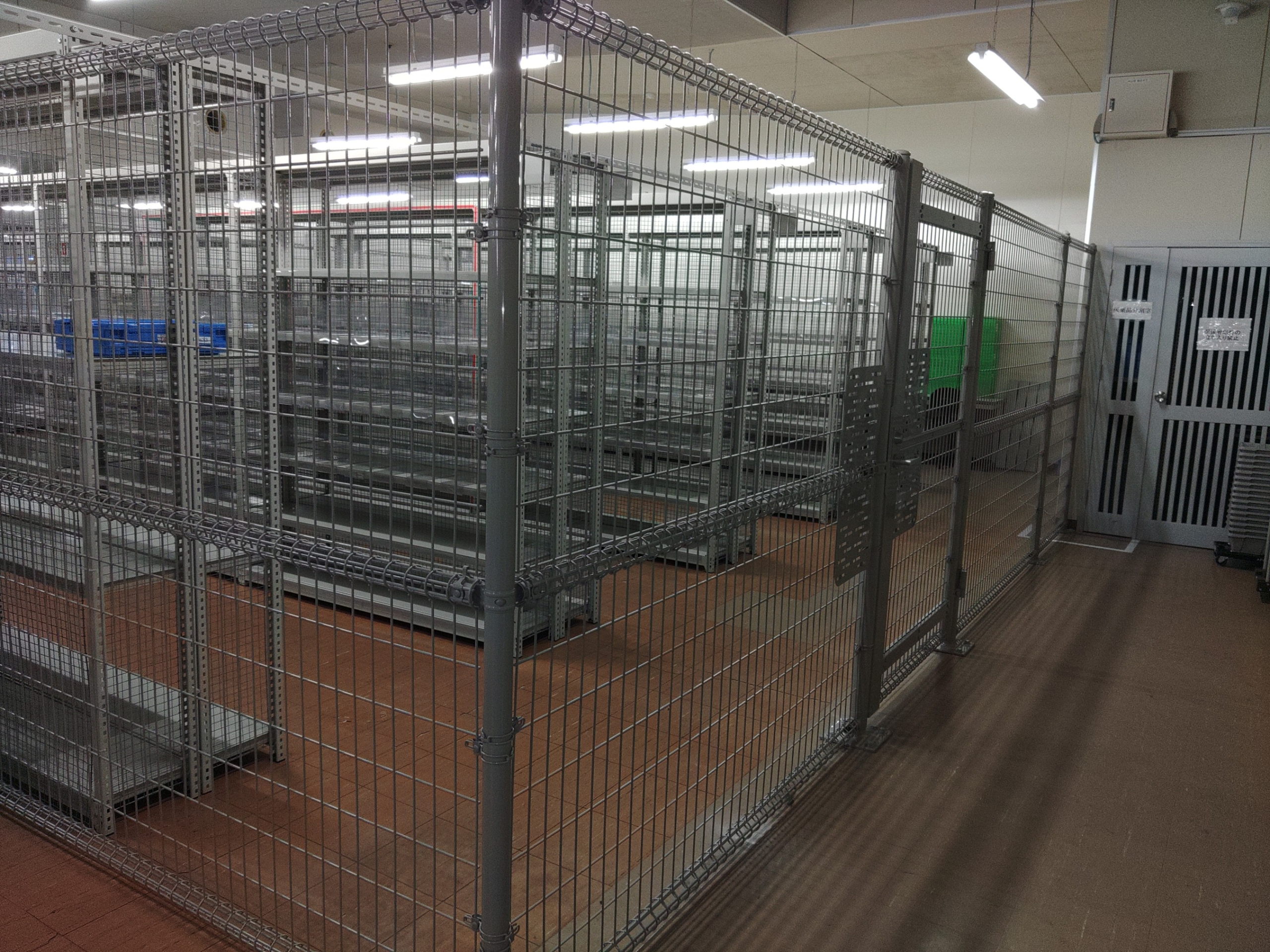 通路と保管エリアの取り合い(alt:既存棚列と新設フェンスの取り合い確認)